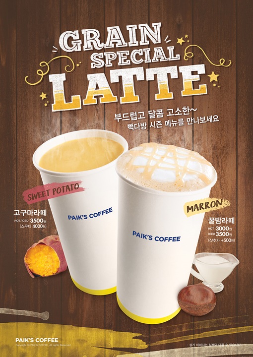 커피전문점브랜드 빽다방은 겨울 대표 간식인 고구마와 꿀밤을 활용한 달콤 고소한라떼 메뉴인 ‘고구마라떼’와 ‘꿀밤라떼’를 재출시했다. 고구마라떼와 꿀밤라떼는 각각 2017년과 2015년에 출시되어 가을 • 겨울시즌 인기 메뉴로 떠올라 올해 10월 초 재출시된 것으로, 재료 본연의 맛과 향을 살려 어린아이부터 어른들까지 든든한 한 끼 식사로 즐길 수 있는 것이 특징이다. 두 메뉴 모두 시원한 음료로도 즐길 수 있어 마치 고구마 아이스크림이나 밤 아이스크림을 먹는 듯한 색다른 즐거움도 느낄 수 있다.