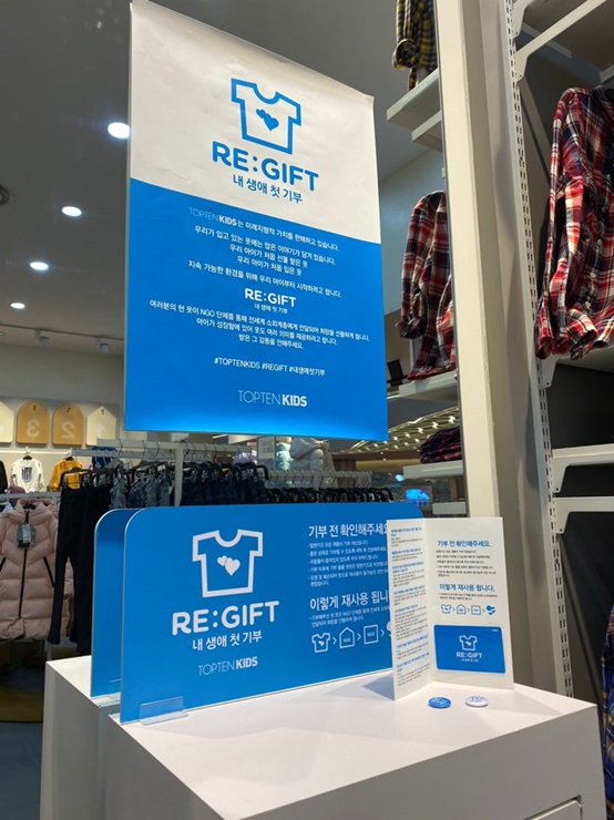 관계자는 “이번 리기프트 캠페인은 ‘내 생애 첫 기부’ 라는 타이틀로 아이들에게 나눔과 공유에 대한 소중한 경험을 함께 느끼는 계기가 될 수 있을 것이다. 또한 옷을 기부한 소비자들께는 리기프트(RE:GIFT) 기부증서 카드와 뱃지를 증정하니 아이들과 함께 많은 동참 바란다”며 취지를 설명했다.