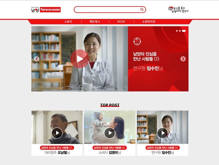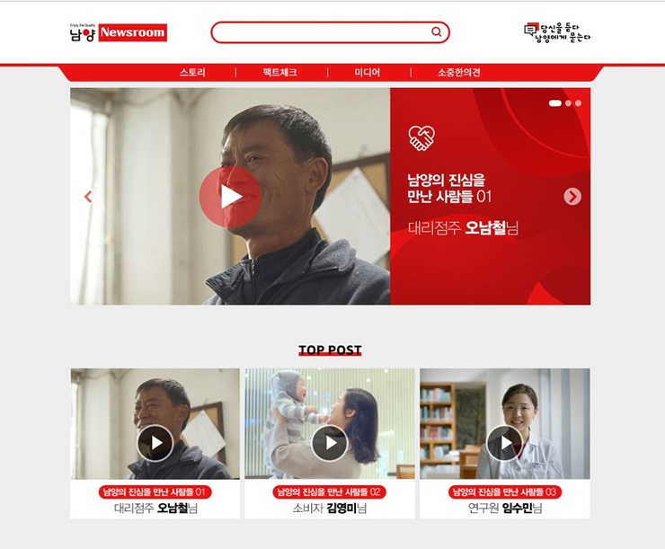또, 남양유업은 공식채널인 ‘뉴스룸’을 오픈하고 가짜 뉴스와 악성 루머에 대해 적극적인 해명에 나선다. 뉴스룸에서는 남양유업에 대해 의견을 남기고 싶은 고객은 누구나 자유롭게 이용할 수 있도록 고객의 소리를 들을 수 있는 창구도 마련된다.