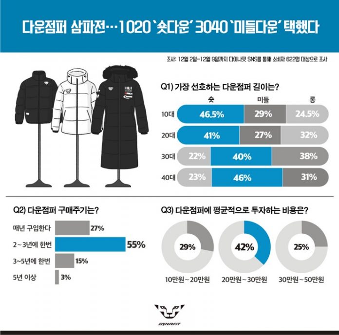 하이퍼포먼스 스포츠브랜드 다이나핏이 지난 12월 2일부터 12월 9일까지 자사 SNS를 통해 소비자 622명을 대상으로 숏, 미들, 롱 다운점퍼 중 이번 시즌 선호도를 조사한 결과, 10대 응답자의 46.5%, 20대 응답자의 41%가 ‘숏다운’을 가장 선호한다고 답했다.