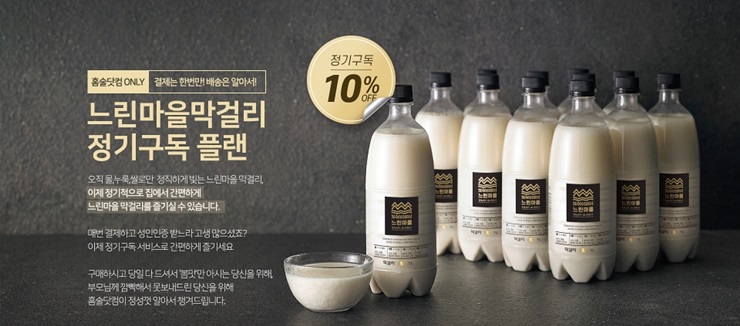 막걸리 제품의 경우 일반적인 단품 판매뿐만 아니라 정기구독 서비스 방식을 함께 선보인다. 홈술닷컴의 ‘막걸리 정기구독 서비스’는 판매 중인 배상면주가 포천LB의 막걸리들을 설정된 주기에 맞춰 정기적으로 배송하는 서비스로, 정기구독 신청 고객에게는 10%의 구매 할인 혜택과 맛이 만족스럽지 않을 경우 제품을 교환해주는 품질보증 서비스가 제공된다.