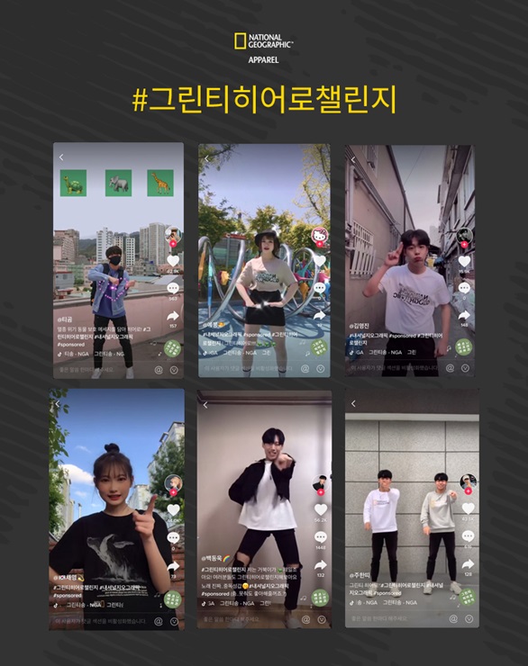 내셔널지오그래픽 어패럴은 지난 4월부터 소비자들에게 캠페인 메시지를 더욱 쉽게 전달하기 위해 틱톡(TikTok) 등 SNS에서 ‘그린티 히어로 챌린지’ 이벤트를 실시했다. 해당 챌린지는 특별 제작된 ‘그린티 송’에 맞춰 춤추는 영상을 지정된 해시태그와 함께 SNS 채널에 업로드하는 방식으로 진행됐다. 지난달 17일부터 틱톡에서만 캠페인 참여 게시물이 2000건 이상 게재됐으며, 총 890만 명이 틱톡 히어로 챌린지 영상을 시청한 것으로 나타났다.