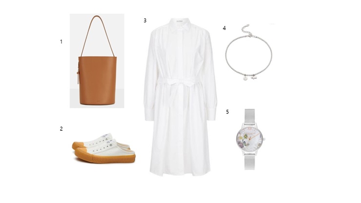 팔목 부분의 셔츠를 걷어 실버 계열의 시계나 팔찌로 레이어드하여 허전한 팔목에 포인트를 주자. 슈즈와 백은 베이직한 디자인의 뮬과 원통형 숄더백으로 매치해 주면 여성스러운 느낌을 한층 더 업 시켜주는 원피스 스타일링이 완성된다.