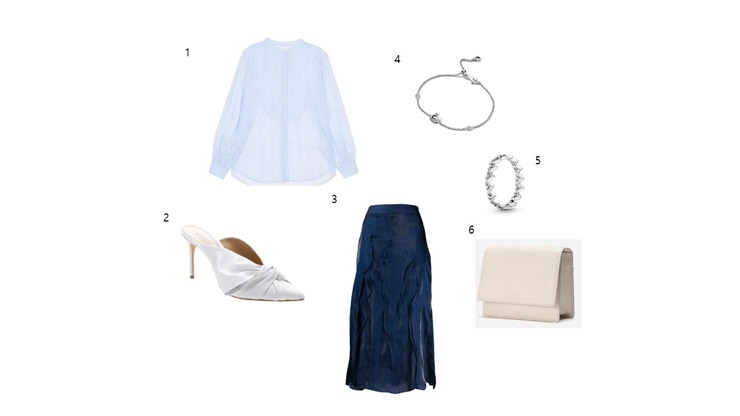 롱 기장의 실크 스커트 제품을 고를 때에는 트임이 있는 것으로 선택하는 것이 좋다. 활동하기에도 편하며 답답한 느낌이 덜할 뿐만 아니라 다리가 더 길어 보이는 효과를 주기에 꼭 참고할 것. 액세서리는 심플한 디자인의 실버 컬러 제품으로 레이어드하는 것을 추천한다. 상의와 구두는 밝은 색상의 스트라이프 블라우스와 뮬 디자인의 구두로 스타일링을 완성하자.