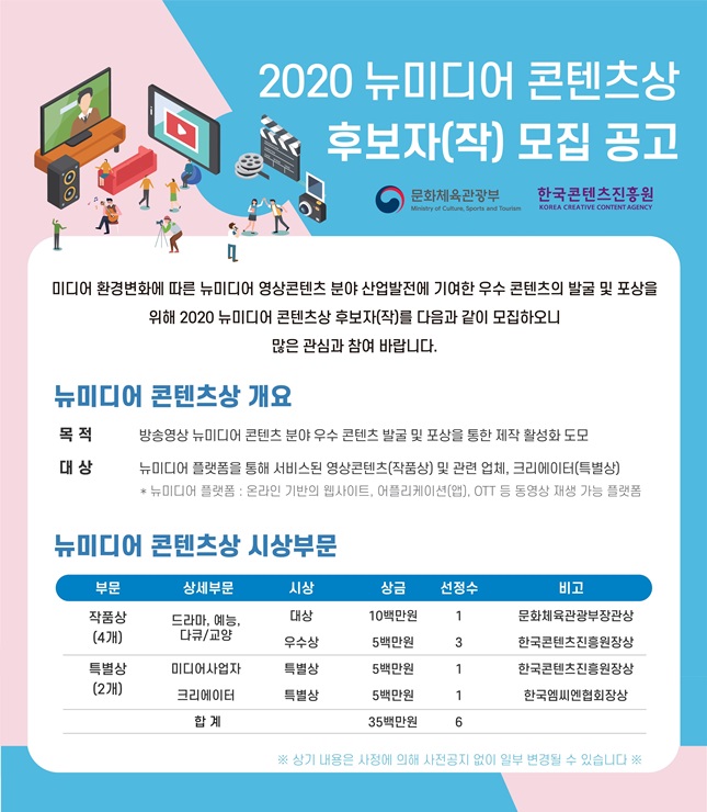 문화체육관광부(장관 박양우)와 한국콘텐츠진흥원(원장 김영준, 이하 콘진원)은 방송영상 뉴미디어 분야의 우수 방송콘텐츠를 발굴하고, 이를 포상하기 위한 ‘2020 뉴미디어 콘텐츠상’ 후보자(작)를 오는 7월 13일까지 추천 받는다.