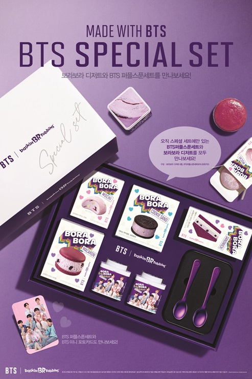 ‘BTS 스페셜 세트’에 포함된 ‘보라보라’ 신제품의 경우, 제품 패키지에 방탄소년단 멤버 단체 사진을 활용한 보라보라 블록팩(2종), 보라보라 아이스 모찌, 보라보라 아이스 마카롱, 보라보라 아이스 샌드위치, 보라보라 아이스 쿠키샌드를 포함한 총 6종으로 구성됐다. 배스킨라빈스를 상징하는 ‘핑크 스푼’을 보라색으로 탈바꿈한 ‘BTS 퍼플 스푼세트(방탄소년단 멤버들의 모습을 담은 ‘포토카드’ 포함)’ 등도 함께 담겨 알찬 구성을 자랑한다. 프로모션 상품 소진시 행사는 자동 종료된다.