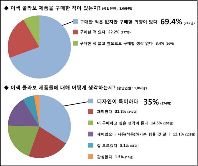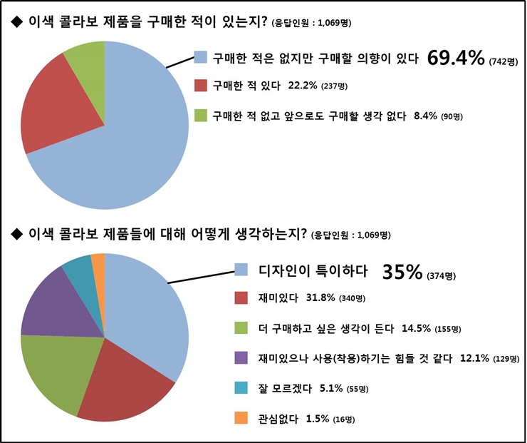 ‘이색 콜라보레이션 제품들에 대해 어떻게 생각하는지’에 대한 질문에는 디자인이 특이하다(35%, 374명), 재미있다(31.8%, 340명), 더 구매하고 싶은 생각이 든다(14.5%, 155명), 재미있으나 사용(착용)하기는 힘들 것 같다(12.1%, 129명), 잘 모르겠다(5.1%, 55명), 관심없다(1.5%, 16명)라고 응답했다.