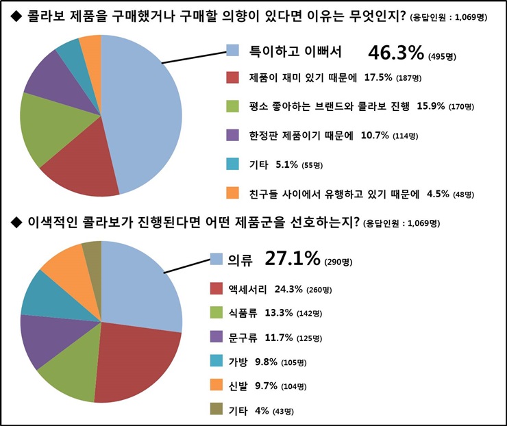 ‘이색적인 콜라보레이션이 진행된다면 어떤 제품군을 선호하는지’에 대한 질문에는 의류(27.1%, 290명), 액세서리(24.3%, 260명), 식품류(13.3%, 142명), 문구류(11.7%, 125명), 가방(9.8%, 105명), 신발(9.7%, 104명), 기타(4%, 43명)로 나타났다.