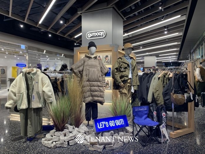 ‘아웃도어 프로덕츠’의 첫 단독숍 1호점 매장이 오픈했다. 메탈과 우드, 스톤을 활용해 도심속의 아웃도어를 느낄 수 있는 매장 콘셉트로 선보였다. 기존의 Daily Casual 라인에 캠핑의 Grey Label을 추가하여 아웃도어 컨템포러리 브랜드의 느낌을 더한 점이 특징이다.