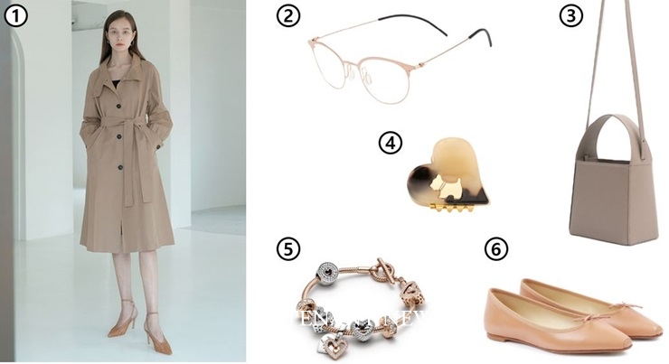 이를테면 누구나 한 벌쯤은 옷장에 있을 법한 베이지 컬러 트렌치코트를 중심에 두고, 핑크빛이 섞인 베이지 플랫 슈즈와 그레이 컬러가 섞인 베이지 토트백, 베이지 톤이 살짝 감도는 골드 브레이슬릿과 안경, 레오퍼드 패턴의 헤어 액세서리를 이용하는 것이다. 비슷한 듯 각각 다른 뉴트럴 톤으로 스타일링했기 때문에 감각적인 스타일링을 선보일 수 있다.