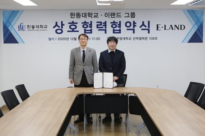 이랜드와 한동대는 지난 9일 경북 포항시에 위치한 한동대학교에서 장순흥 한동대 총장, 현창기 생명과학부 학부장, 이준용 전산전자공학부 학부장, 최형욱 이랜드 최고 전략 책임자, 임희조 이랜드 신사업전략 본부장 및 관련 임직원들이 참석한 가운데 업무 협약식을 진행했다.
