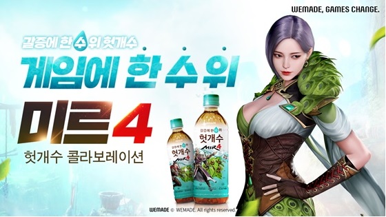 HK이노엔의 대표 식음료 브랜드 헛개수는 위메이드의 모바일 MMORPG 게임 ‘미르4’와 제휴를 맺고 ‘헛개수 미르4’를 공개했다. 게임 유저와 제품 특성상 주요 고객층이 3040이라는 공통점을 가지고 있어 타겟 맞춤형 콜라보라는 점이 눈에 띈다.