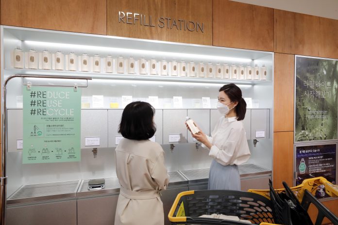 한편, 이마트가 지난해 9월 대형마트 최초로 선보인 세탁세제ㆍ섬유유연제 리필 자판기 ‘에코 리필 스테이션’ 9호점이 4월 22일 지구의 날을 기념해 이마트 청계천점에 추가로 문을 열었다.