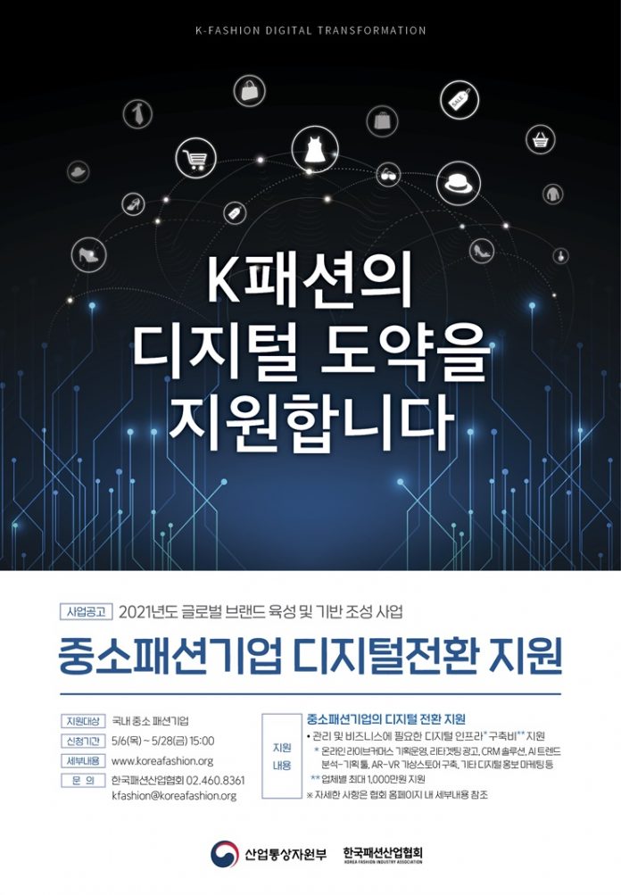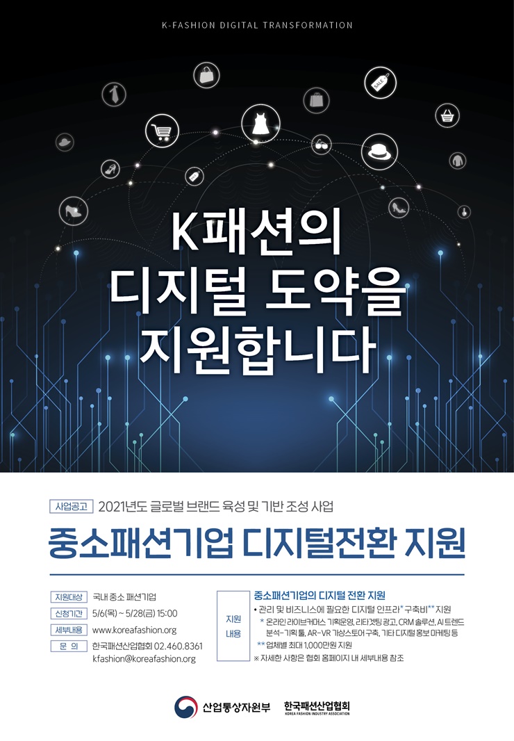 이번 ‘중소패션기업 디지털전환 지원’ 사업의 자세한 내용은 한국패션산업협회 홈페이지 공고(www.koreafashion.org)를 통해 확인할 수 있으며, 해당 공고를 통해 오는 5.28(화) 15:00 까지 온라인 참가 신청 가능하다.