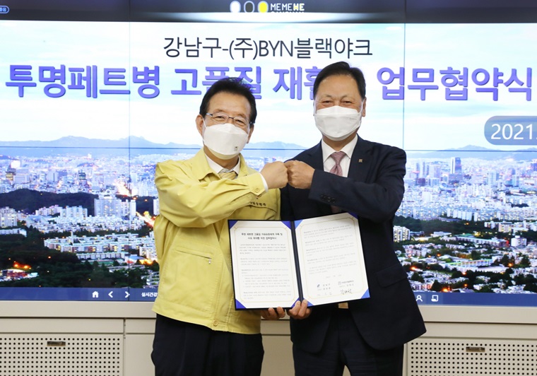 ㈜비와이엔블랙야크(회장 강태선, 이하 블랙야크)가 투명 페트병 재활용 활성화 사업 확대를 위해 강남구와 업무 협약을 체결했다. 10일(월) 오후 강남구청에서 진행된 협약식에는 강태선 블랙야크 회장과 정순균 강남구청장이 참석했다.
