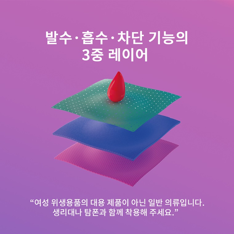 발수ㆍ흡수ㆍ차단 기능을 우선순위로 안쪽 면부터 바깥 면 순서로 디자인되었으며, 부드럽고 통기성 높은 소재인 ‘에어로레디 (Aeroready)’를 적용해 착용감을 높였다. 다만, 해당 제품은 여성 위생용품의 대용 제품이 아닌 일반 의류이므로 생리대나 탐폰과 함께 착용해야 한다.