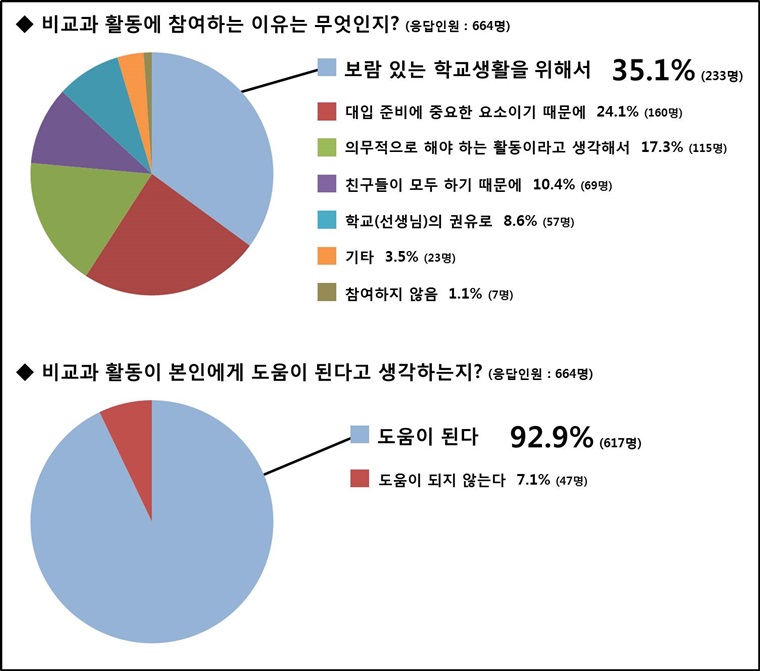 ‘비교과 활동에 참여하는 이유는 무엇인지’에 대한 질문에는 보람 있는 학교생활을 위해서(35.1%, 233명), 대입 준비에 중요한 요소이기 때문에(24.1%, 160명), 의무적으로 해야 하는 활동이라고 생각해서(17.3%, 115명), 친구들이 모두 하기 때문에(10.4%, 69명), 학교(선생님)의 권유로(8,6%, 57명), 기타(3.5%, 23명), 참여하지 않음(1.1%, 7명)이라고 응답했다.