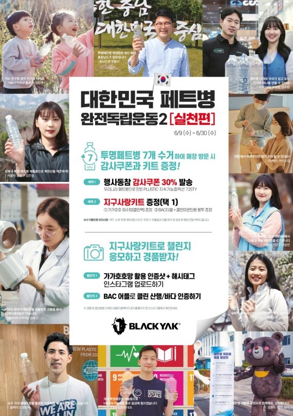 아웃도어 브랜드 블랙야크는 6월 환경의 달을 맞아 소비자와 함께하는 ‘대한민국 페트병 완전독립운동’ 챌린지를 진행한다. 페트병 재활용 과정에서 중요한 첫 단계인 분리배출에 소비자들의 자발적인 동참을 이끌어내기 위해 기획한 실천형 캠페인이다.