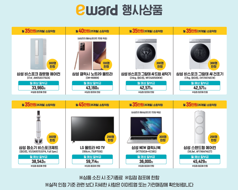 ‘이워드(eward)’란 지난 2019년부터 진행한 이마트만의 캐시백 프로모션이다. 이마트에서 행사 카드로 매월 약정 금액만큼 쇼핑을 하면 이워드 약정 가입 상품의 월 할부금을 전액 돌려 받을 수 있다.