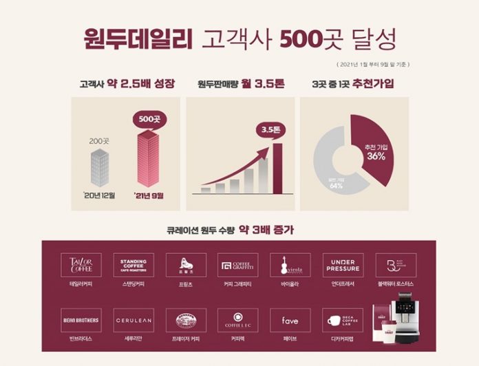 원두 구독 및 커피머신 렌탈 서비스 원두데일리가 고객사 500곳을 확보했다. 커피 유통 스타트업 스프링온워드(대표 정새봄)는 원두데일리 기업 고객수가 작년 말 200여곳에서 9월 말 기준 500곳으로 올 해 2배 이상 늘었다고 30일 밝혔다. 매주 다른 원두를 체험할 수 있는 큐레이션 주문량도 같은 기간 3배 상승했다.