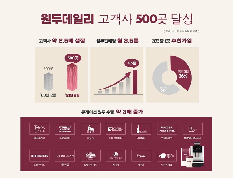 삼성생명, 교보생명, GS건설, 현대아산, LH한국토지주택공사, 한국전력공사 등 대기업, 공공기업 등을 비롯해 핏펫, 숨고, 세탁특공대 등 다양한 스타트업까지 원두데일리 서비스를 도입하며 고객 포트폴리오도 다양해지고 있다. 여기에, 공유주방 업체나 스터디카페 프랜차이즈에도 맞춤형 오피스 커피구독 서비스를 제공하고 있어 연내 가입 기업 고객수는 600개를 넘어설 것으로 기대된다.