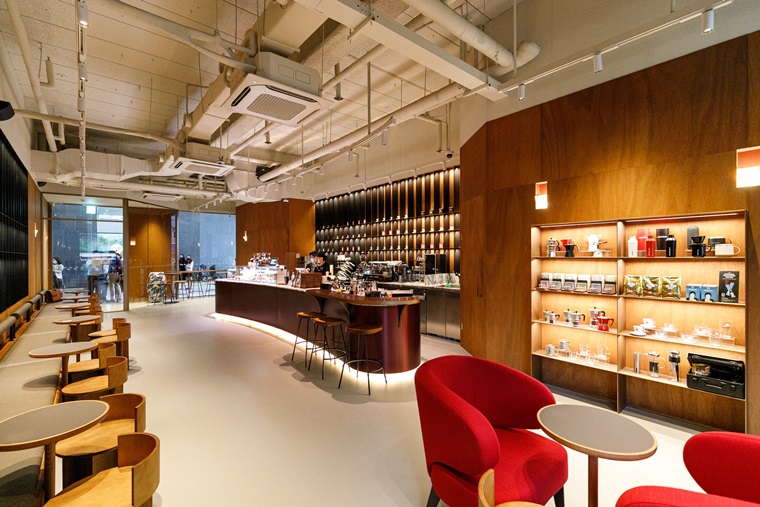 매장 공간도 에스프레소 바 콘셉트에 맞춰 ‘크레마(에스프레소의 거품을 뜻하는 이탈리아어)’의 황금색 컬러를 주로 활용했으며, 외부로 전면 개방되는 창과 여유로운 테라스 공간을 갖췄다.