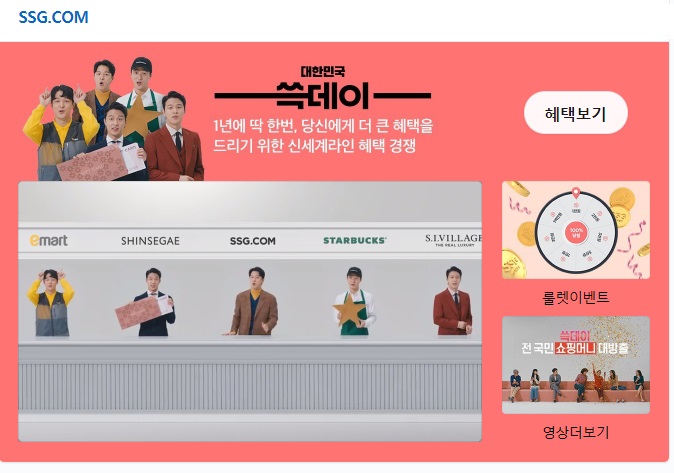 예를 들어 ‘럭키박스’를 주제로 W컨셉은 ‘패션 럭키박스’, 신세계I&C는 ‘게임 럭키박스’를 내세워 경쟁한다는 식이다. 신세계그룹은 12일 온라인과 TV를 통해 ‘신세계 라인 혜택 경쟁’ 티저 영상을 공개하며 이번 쓱데이를 알렸다. 또한 쓱데이 미리 즐기기의 일환인 사전 이벤트 ‘전 국민 쇼핑 머니 대방출’ 영상도 함께 공개했다.