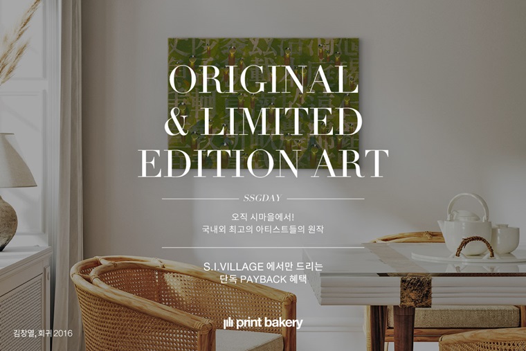 올해는 대한민국 쓱데이 행사를 맞아 이달 25일 자정부터 30일까지 총 118점의 미술품 판매에 나섰다. 이번 판매를 위해 서울 옥션에서 론칭한 미술 대중화 브랜드 프린트베이커리와 손잡고 김창열, 이우환, 장마리아, 유선태, 카우스, 시오타치하루 작가의 오리지널 작품과 프리미엄 에디션을 에스아이빌리지에서 단독 공개했다.