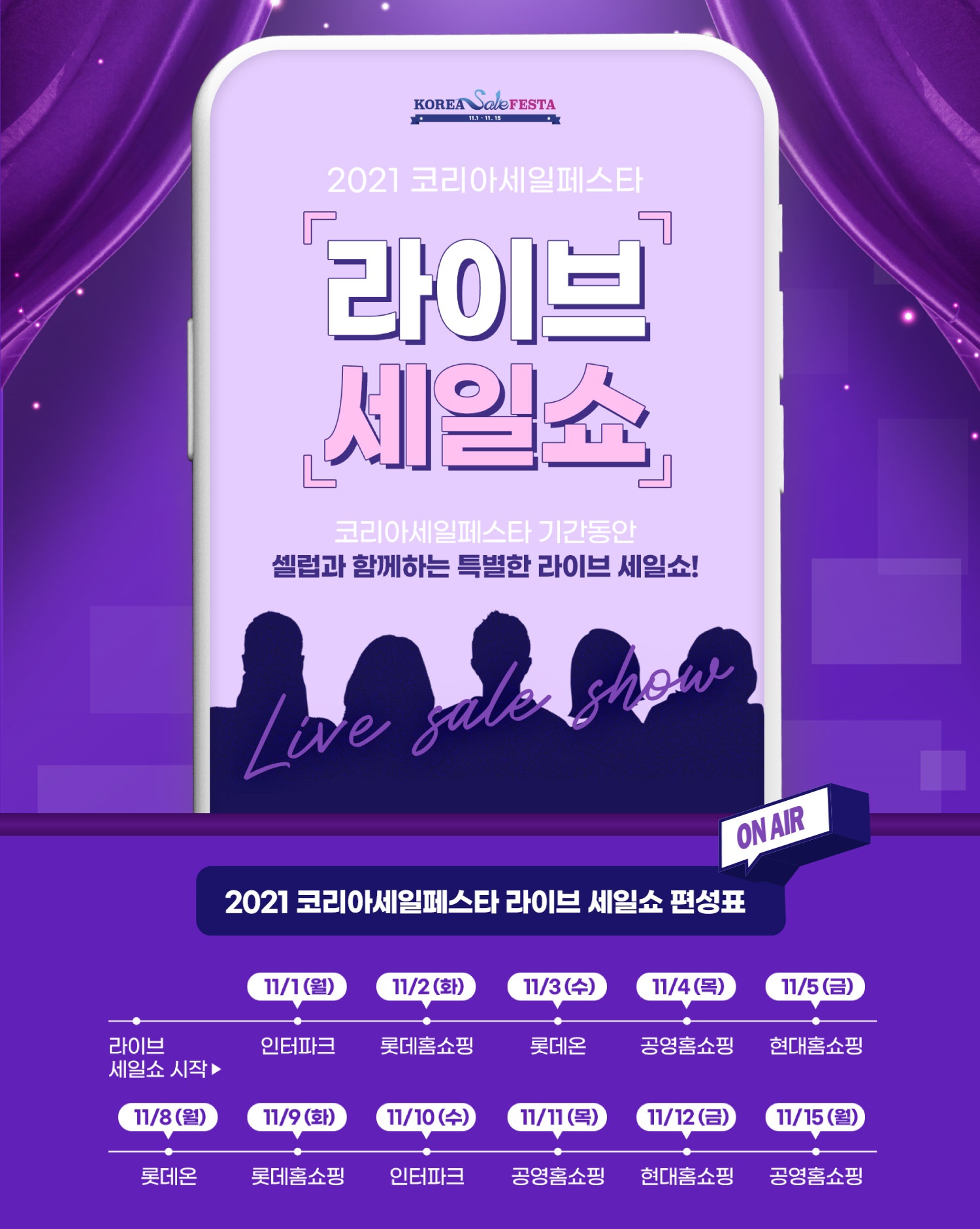 한편, 라이브세일쇼 방송편성은 코리아세일페스타 홈페이지(www.koreasalefesta.kr)에서 확인할 수 있으며, 행사 관련 자세한 내용은 코리아세일페스타 홈페이지 내 기획전 페이지*에서 확인할 수 있다