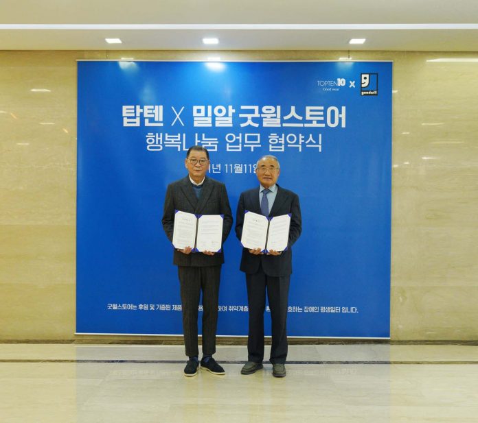 신성통상(대표 염태순) SPA브랜드 탑텐(TOPTEN10)이 밀알복지재단(이사장 홍정길) 굿윌스토어와 업무협약(MOU)를 체결하고 행복나눔 캠페인을 진행한다.
