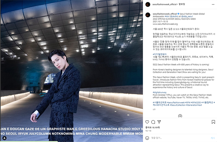 패션쇼 영상 외에도 글로벌 앰버서더 카이와 DPR라이브, 헤이즈, 이희문 등의 공연 등 다양한 영상 콘텐츠를 기획해 디지털 방식으로 열린 ‘서울패션위크’의 장점을 극대화하며 K-POP의 위상을 드높였다.