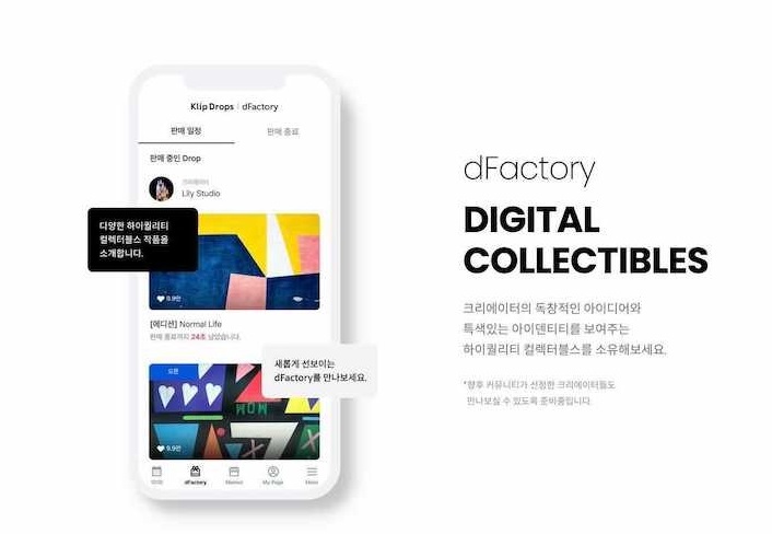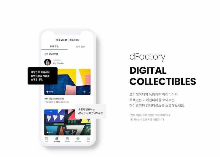 다양한 장르를 아우르는 크리에이터들의 굿즈(goodsㆍ기획 상품)와 콜렉터블스(collectiblesㆍ수집품)를 포함한 NFT를 수집할 수 있는 ‘디팩토리(dFactory)’도 공개된다. 기존의 미술 작품을 넘어, 영화나 브랜드, 또는 독창적인 프로젝트들의 고유한 특색이 담긴 굿즈와 아트 워크 등 다양한 예술 영역을 포괄하여 구성한다. 추후, 유저들이 직접 아티스트나 브랜드를 추천하고 투표할 수 있는 공간도 마련될 예정이다. 디팩토리는 오는 18일 9시부터 상시 운영된다.