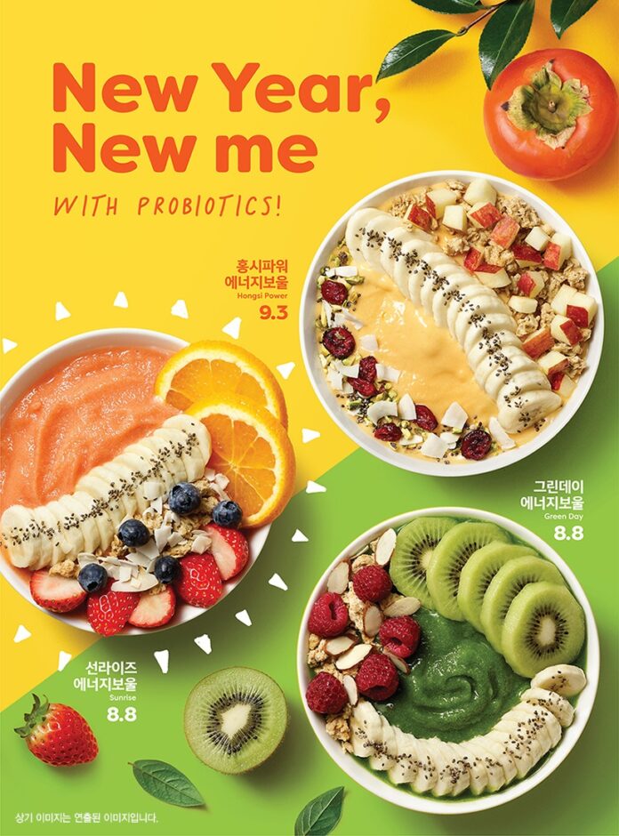 신제품 3종은 오렌지주스에 딸기ㆍ파인애플ㆍ바나나 등을 갈아 넣은 상큼한 맛의 스무디 위에 생 오렌지ㆍ딸기ㆍ코코넛칩 등 토핑을 얹어 새해 일출을 연상시키는 ‘선라이즈 에너지보울’, 애플주스와 케일ㆍ망고ㆍ바나나 등 과일과 채소를 혼합하여 갈아낸 뒤 생 키위, 라즈베리 토핑을 더한 ‘그린데이 에너지보울’, 홍시와 요거트가 섞인 달콤한 스무디 위에 고소한 치아씨드ㆍ피스타치오ㆍ건크렌베리가 토핑으로 듬뿍 담겨 부드럽고 달콤하게 즐길 수 있는 ‘홍시파워 에너지보울’ 등 3종이다.