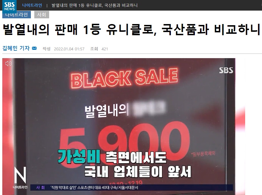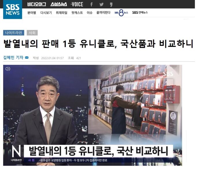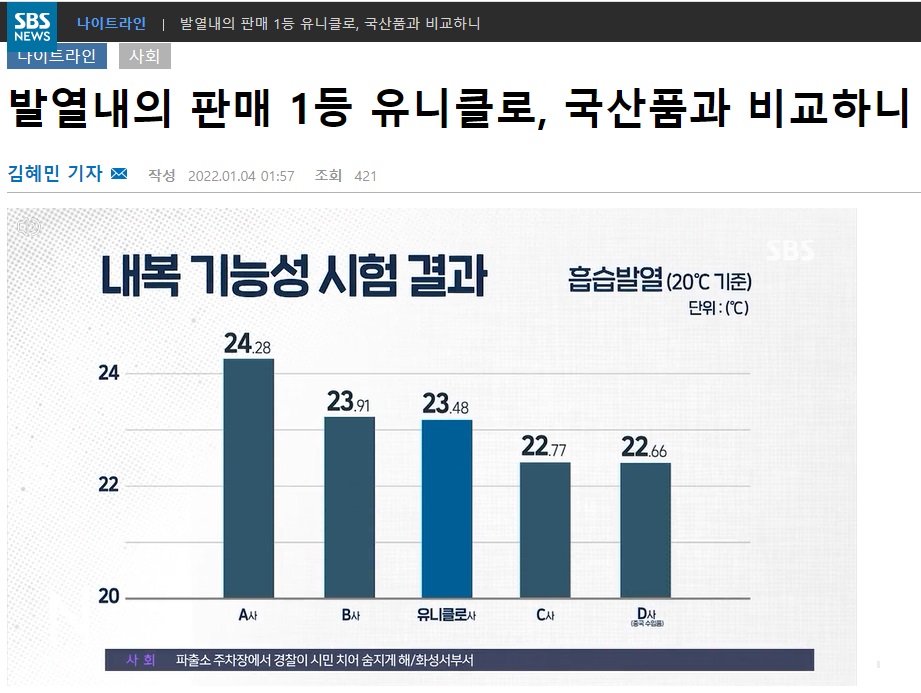 SBS는 최근 국내 브랜드 제품과 유니클로 제품, 그리고 중국 브랜드 제품 등 5개를 직접 구매해 국가공인기관인 한국의류시험연구원에 ‘흡습발열’ 시험을 의뢰해 발열 기능에 대한 결과를 보도했다.