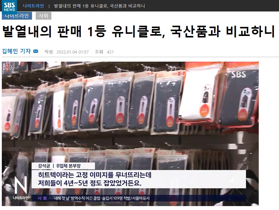 우리나라에서 가장 인기가 높은 것으로 알려진 유니클로의 발열 내의인 히트텍이 실제 국산 브랜드에 비해 기능이 떨어지는 것으로 소개된 것이다.
