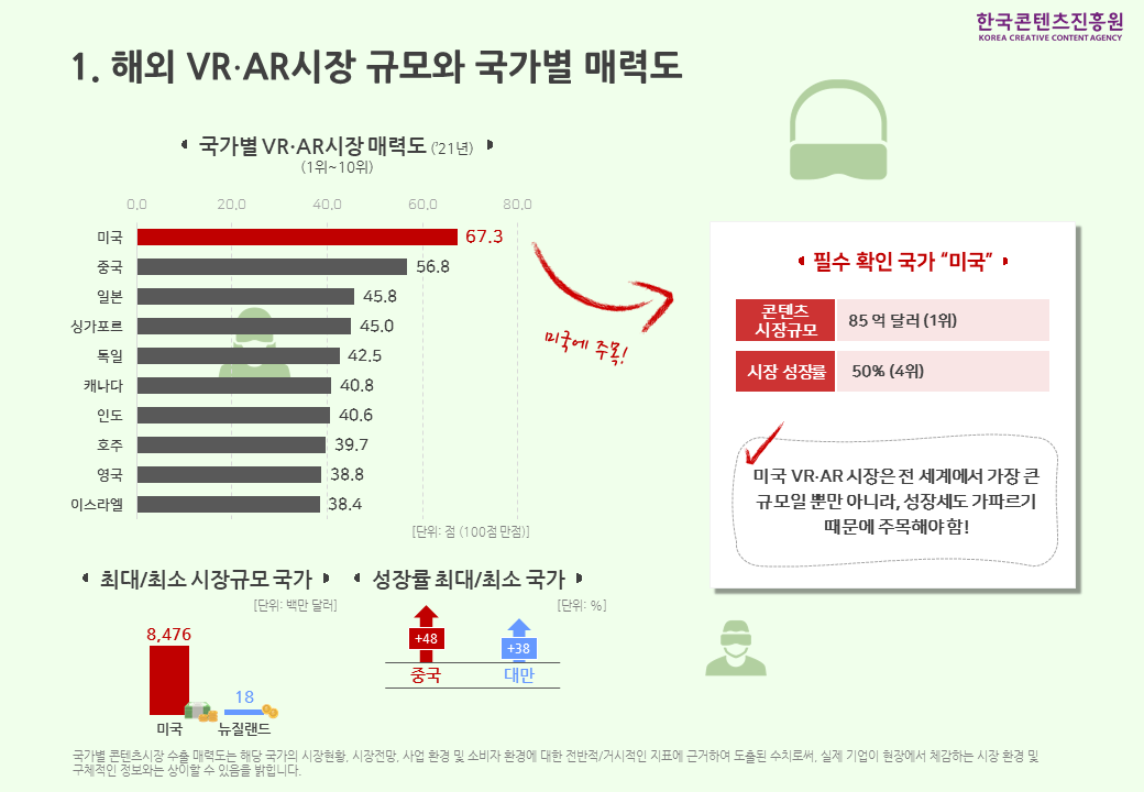 방송, 게임, 애니메이션, 캐릭터, 만화, 음악, 패션, VR·AR 등 콘텐츠 8개 장르에 대해 국가별 각 장르 시장의 규모와 수출 매력도, 전년 대비 국가별 매력도 비교, 해외시장 진출 시 각국 유의·규제사항 등의 정보를 얻을 수 있다.
