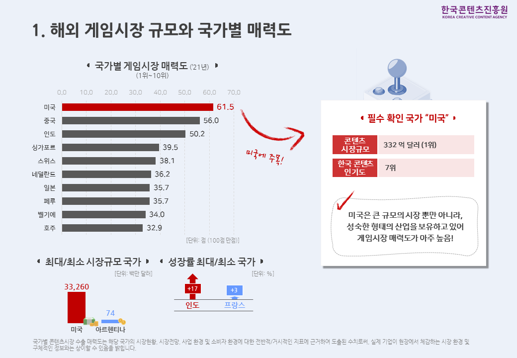 한편, 콘진원은 해외진출 대상국을 고민하는 콘텐츠기업들에게 실질적인 도움이 되고자 미국, 중국, 일본을 비롯한 콘텐츠 수출 주요 36개국 시장매력도를 분석한 ‘장르별 콘텐츠 해외시장 동향분석’을 오는 7일부터 ‘웰콘’을 통해 제공한다.