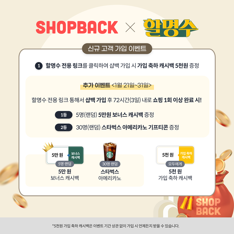 박명수가 직접 촬영한 사진은 샵백 홈페이지 및 앱 등에서 확인할 수 있다. 샵백은 이번 협업을 기념하고 더 많은 고객들에게 혜택을 제공하고자 오는 31일(월)까지 캐시백 증정 이벤트를 진행한다. ‘할명수’ 채널의 ‘더보기란’ 및 ‘고정 댓글’에 게재된 링크를 통해 회원 가입 후 72시간 내 첫 구매 시 구매 금액에 상관없이 추첨을 통해 5만 원 보너스 캐시백(5명), 스타벅스 아메리카노 기프티콘(30명)을 제공한다. 또, 이벤트 기간과 관계없이 해당 링크로 가입 시 무조건 5000원의 가입 축하 캐시백을 지급해 더 많은 고객이 샵백의 혜택을 누릴 수 있도록 했다.