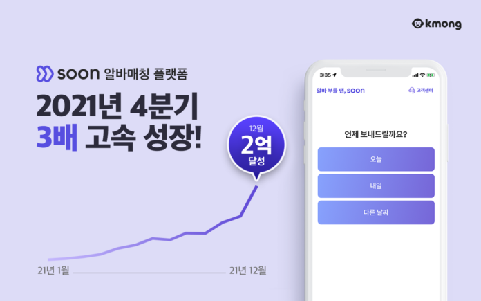 프리랜서 마켓 플랫폼 (주)크몽(대표 박현호)에서 운영 중인 간편 알바 매칭 서비스 쑨(soon)이 지난해 4분기에만 300% 성장하며 월 거래액 2억원을 돌파했다고 밝혔다.