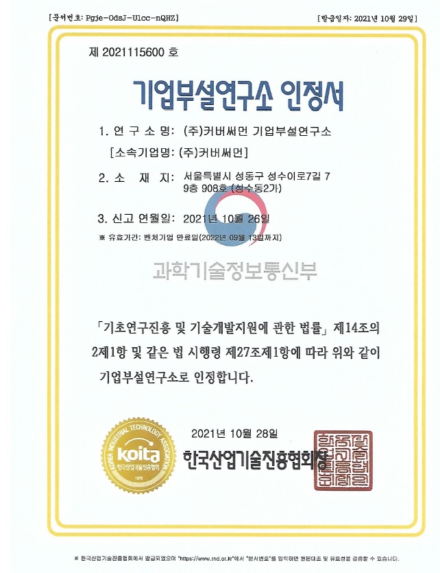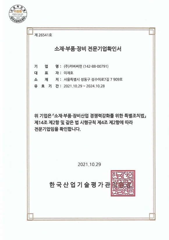 또한 한국산업기술평가관리원(KEIT)의 소부장(소재˙부품˙장비) 전문 기업 인증을 받으면서 커버써먼은 산업기능 요원제도, 사업화 및 경영지원, 기술 지원 및 기술개발 등 소재 부품장비 산업분야 성장을 위한 전반적인 지원 사업 혜택도 받는다.