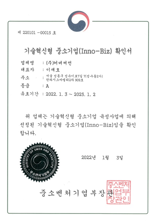최근에 획득한 이노비즈 인증은 혁신을 뜻하는 Innovation과 기업을 뜻하는 Business의 합성어로, 기술 우위를 바탕으로 경쟁력을 확보한 기술혁신형 중소기업을 지칭한다. 이노비즈 지정 제도는 기술혁신형 중소기업을 집중 지원해 여타 기업의 기술혁신을 선도하는 역할을 부여하고 국민경제적 기여도를 높이기 위해 시행됐다.