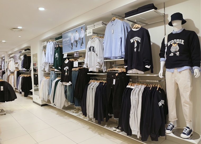 또한 유동 인구의 연령대와 성비가 고른 특성에 맞춰 전체 매장 면적의 20%를 생필품 라인과 베이직 라인으로 구성했다. 발열내의 ‘웜테크’와 기본 티셔츠 등 스파오의 베이직 상품 전체 라인업을 만나볼 수 있다.